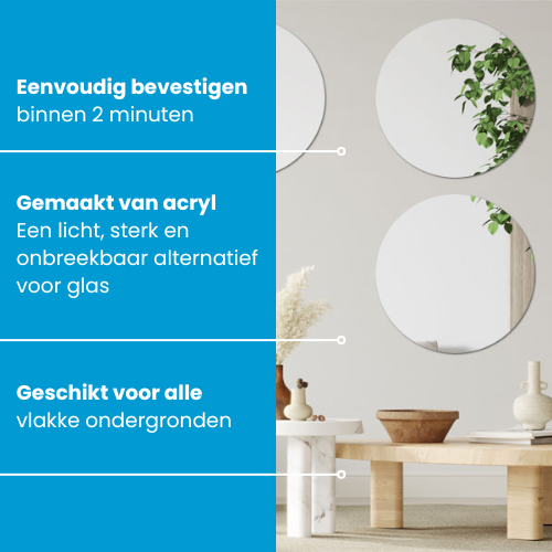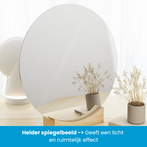 De plakspiegel rond 50×50 cm is gemaakt van hoogwaardig acryl: een sterk, helder en onbreekbaar alternatief voor glas. Acryl is tot 30 keer sterker, waardoor het niet kan versplinteren bij een val of stoot. Dat maakt deze zelfklevende spiegel rond perfect voor gezinnen met kinderen of drukke huishoudens.